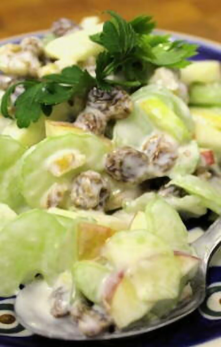 В глубокой салатнице смешиваются нарезанные сельдерей и яблоко, которые поливаются свежевыжатым лимонным соком и тщательно перемешиваются. Затем в массу добавляются предварительно порубленные грецкие орехи и размоченный изюм. Чтобы завершить процесс, салат заправляется сметаной, а при необходимости немного подсаливается и приправляется черным молотым перцем.