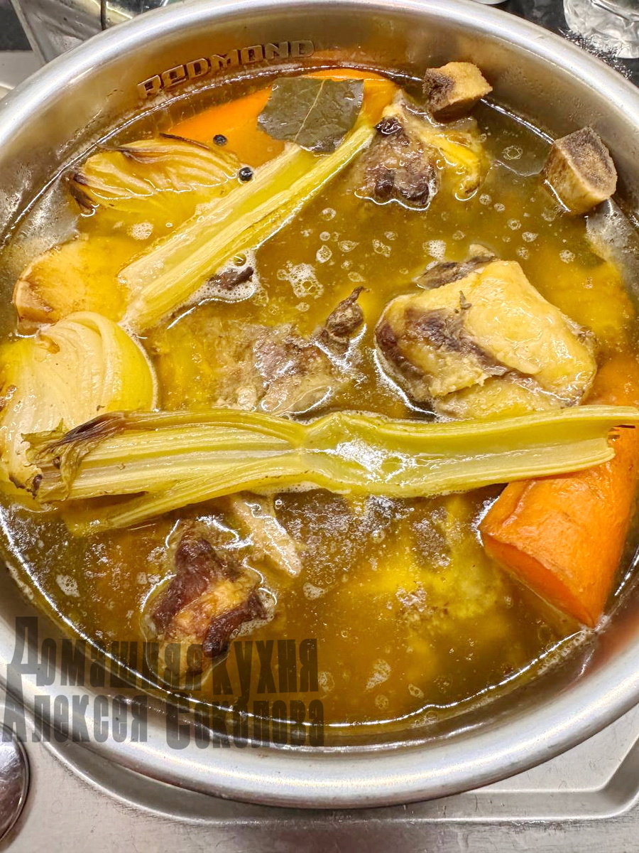 Первым делом кости и коренья нужно запечь в духовке при температуре 180-190 градусов. Как только они слегка подрумянятся, можно будет наслаждаться их ароматом, который наполнит кухню. Жир, который выделится, желательно оставить в стороне, но его запеченный вариант будет отличной закуской, пишет канал "Домашняя кухня Алексея Соколова".