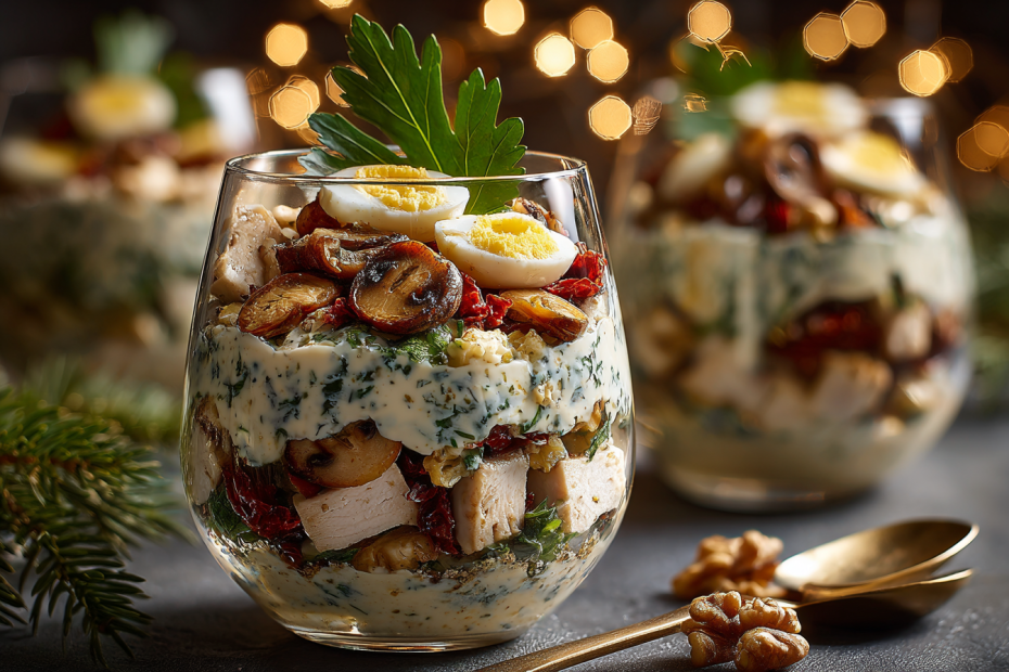 Такой салат станет не только изюминкой вашего новогоднего стола, но и прекрасно украсит любое застолье. Его легко можно подать в мини-бокалах, что добавит оригинальности и стиля. Это блюдо полностью соответствует идее низкоуглеводного меню, позволяя наслаждаться праздником, сохраняя при этом легкость и свежесть.