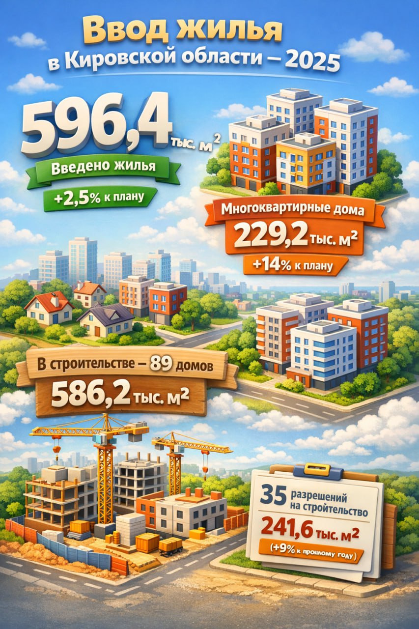 В Кировской области по итогам 2025 года построили 596,4 тыс. кв. метров жилья. Это на 2,5% выше плана, который региону поставил Минстрой России (582 тыс. кв. метров) в рамках проекта «Жилье» нацпроекта «Инфраструктура для жизни».