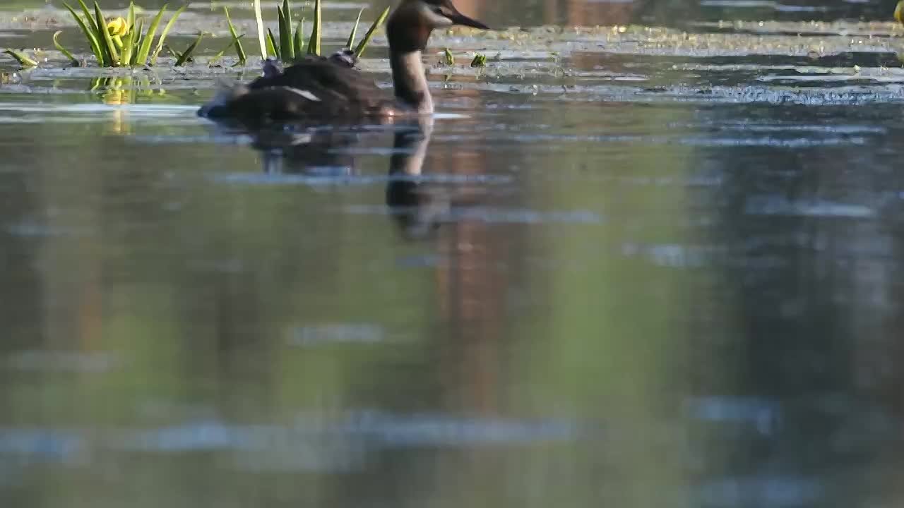 на видео Николая Мякишева: "полосатики"-птенцы отправились в первое плавание на спине чомги-мамы.