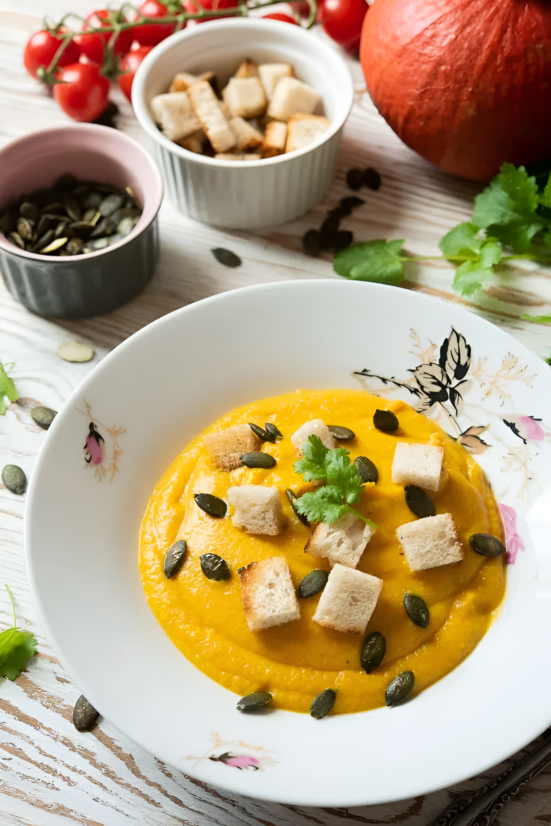 Подавайте тыквенный крем-суп с гренками и посыпкой из обжаренных тыквенных семечек. Это не только украсит блюдо, но и добавит интересные текстурные контрасты. Превратите обед или ужин в настоящее гастрономическое приключение, наслаждаясь каждым глотком этого восхитительного супа.