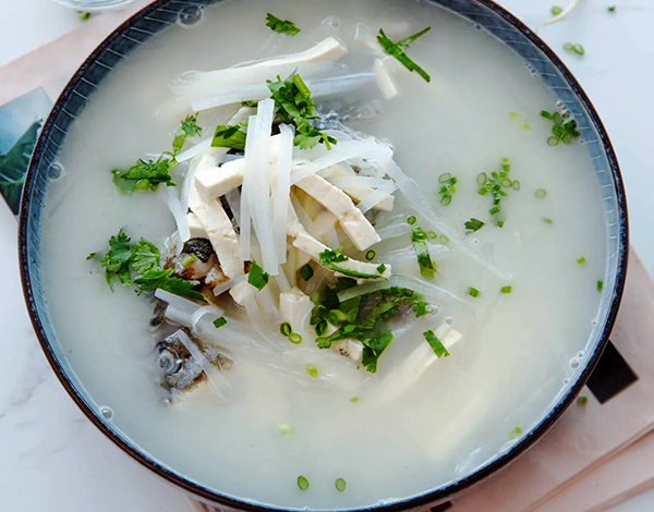 Этот суп является одним из наиболее деликатных и сбалансированных блюда китайской кухни. Основные ингредиенты — свежая рыба, чаще всего карась, натертый дайкон, тофу и немного имбиря. Это легкое блюдо без острых приправ, в нем ощущается умами и нежный аромат.