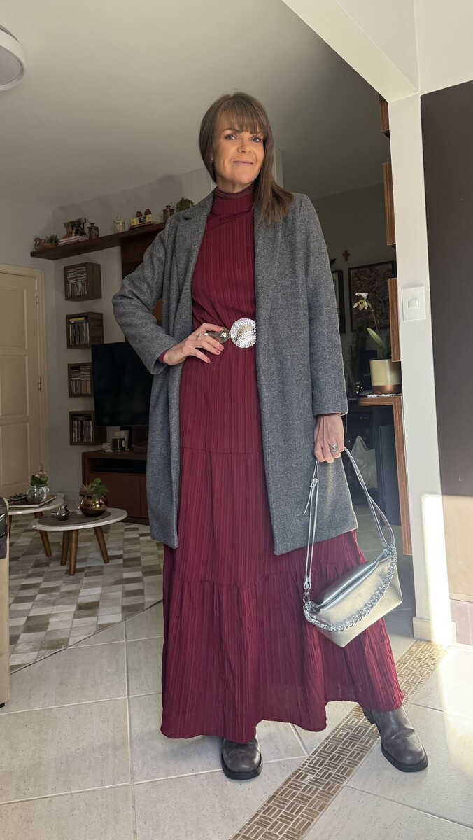 - Элегантное бордовое платье: Свободное платье в пол с мелкой плиссировкой — это идеальный способ выглядеть женственно и стильно. Его можно дополнить поясом с металлическими деталями и серым пальто без пуговиц для завершенного образа.