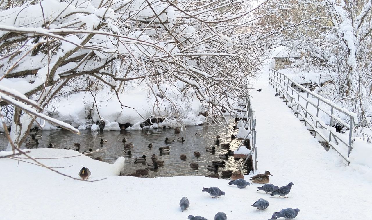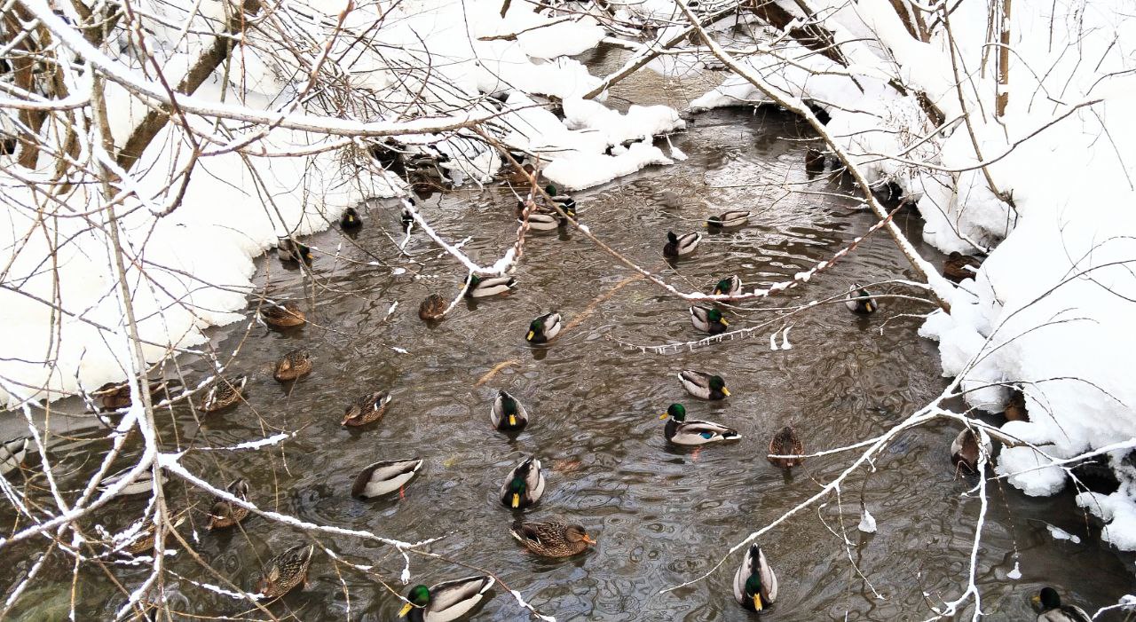 Зимний утиный рай на берегах речки Чумовицы. Пока утки спасаются тем, что быстрое течение образовало полынью. В воде, как говорится - лапки греют. А вот что будут делать пернатые, когда придут морозы, пока не ясно.