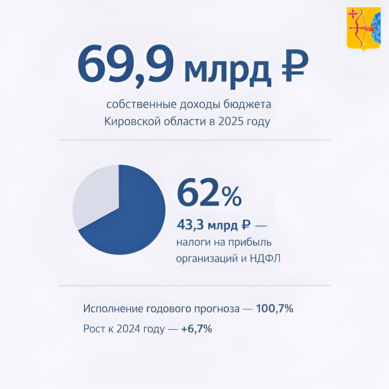 За 2025 год в бюджет Кировской области поступило 69,9 млрд рублей собственных доходов. Годовой прогноз исполнен на 100,7%.