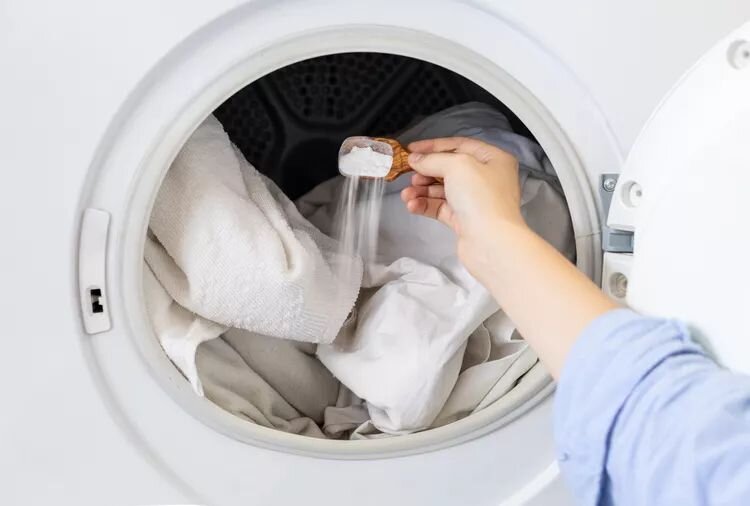 - Пищевая сода. Это доступное средство не только устраняет запахи, но и возвращает белизну цветным тканям. Рекомендуется использовать 2 столовые ложки на стандартную загрузку, чтобы избежать образования осадка.