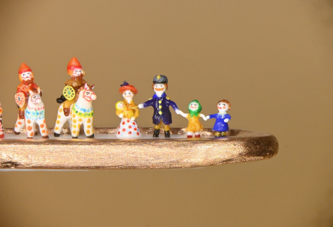 Барыня, три богатыря, семья с тремя детьми и собачки уместились в ушке золотой иглы. Высота фигурок от 0,16 мм (собачка) до 1 мм (богатырь на коне). Мастер трудился над композицией месяц.