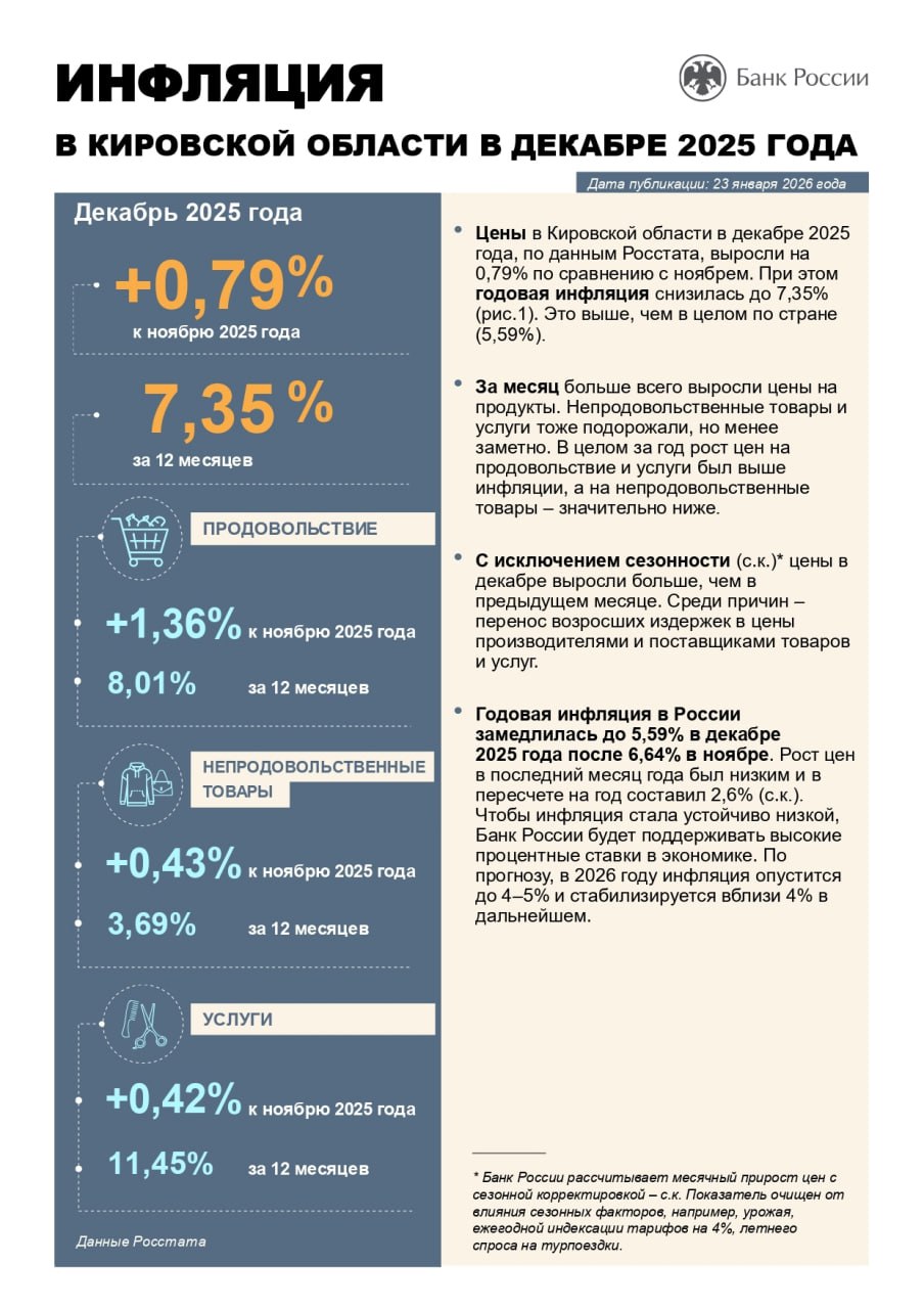 «Цены в Кировской области в декабре 2025 года, по данным Росстата, выросли на 0,79% по сравнению с ноябрем. При этом годовая инфляция снизилась до 7,35%. Это выше, чем в целом по стране (5,59%)»,