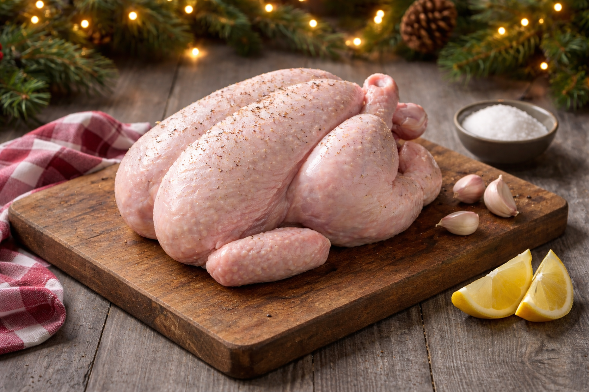 Курица маринуется в смеси кетчупа, горчицы, паприки и розмарина, затем запекается целиком. За 10–15 минут до готовности смазывается ароматным масляно-зелёным соусом; блюдо получается сочным и ароматным.