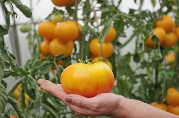 Плоды формируются крупные, насыщенно-желтого цвета, часто с легкой ребристостью у плодоножки. Мякоть мясистая и сочная, с балансом сладости и легкой кислинки, что делает их пригодными как для салатов, так и для переработки. Сроки созревания ранние, что позволяет завершить основное плодоношение до пика фитофторозов.