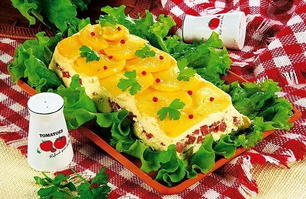 На 6 порций выходит салют из слоёв: тонкие кружочки картофеля, щедрая творожно-сметанная заливка и кубики ветчины, соединённые сливочным маслом и лёгким ароматом паприки. Всё гармонично, без лишних сложностей, и в меру сытно.