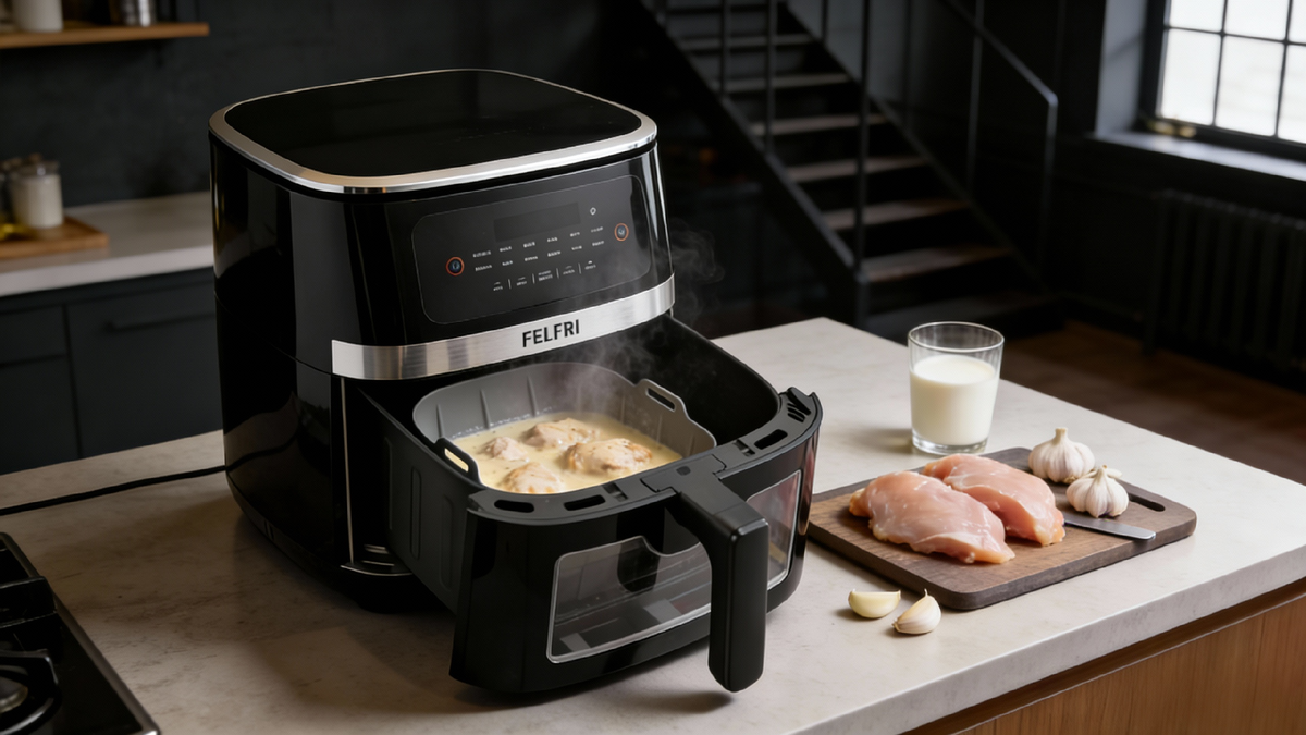 Утром не найдёшь времени на долгие подготовки, а вечером хочется чего-то сочного и теплого. Именно такой простой вечерний сервис помогает вернуться к домашнему комфорту — курица, окрашенная румяной корочкой и окутанная густым сливочным соусом, готова за разумное время в аэрогриле.