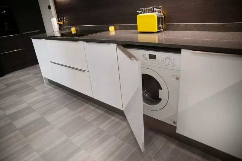 Каждое метрочное решение имеет значение: стиральная машина на кухне освобождает ванную, упрощает доступ к водоснабжению и канализации, а при грамотной планировке позволяет сохранить целостность интерьера.