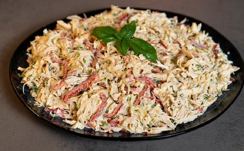 Добавьте shredded meat к остальным компонентам. Не забудьте учесть, что соль уже есть в квашеной капусте и мясе. Приправьте салат черным и острым красным перцем по вкусу и тщательно перемешайте до однородности.
