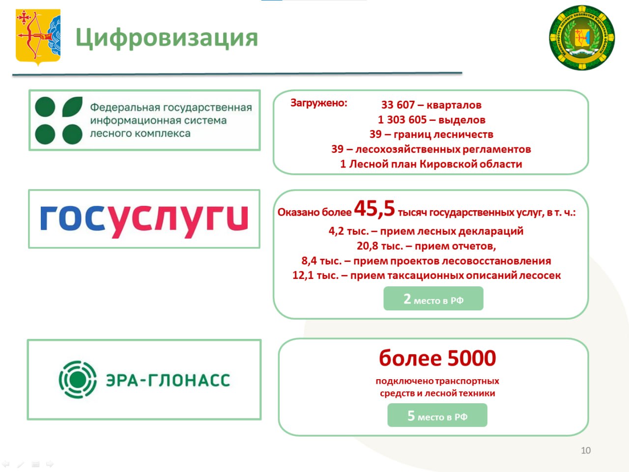 В рамках работы комитета Совета Федерации по экономической политике в декабре 2025 года Кировская область была отмечена на втором месте в рейтинге регионов по загрузке данных и оказанию государственных услуг в электронном виде через ФГИС ЛК. (Загружено в систему 33 607 кварталов, 1 303 605 выделов, 39 границ лесничеств, 39 лесохозяйственных регламентов, 1 Лесной план Кировской области). В качестве примера масштаба цифровизации отрасли можно привести тот факт, что только по линии лесного хозяйства в 2025 году в регионе в электронной форме было предоставлено свыше 45,5 тысяч государственных услуг.
