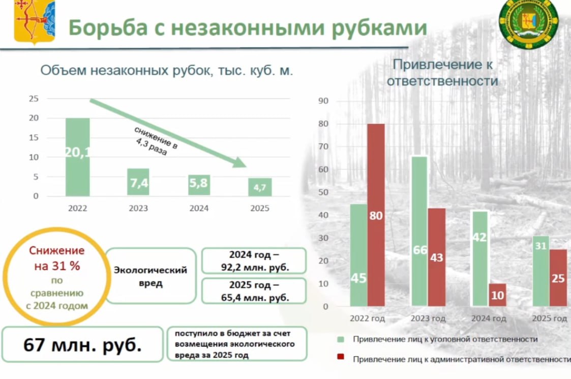 Размер экологического вреда (65,4 млн рублей) относительно показателя 2024 года снижен на 31%. За совершение незаконных рубок в 2025 году к уголовной ответственности привлечено 31 лицо. В счет возмещения экологического вреда за 2025 год поступило более 67 млн рублей.