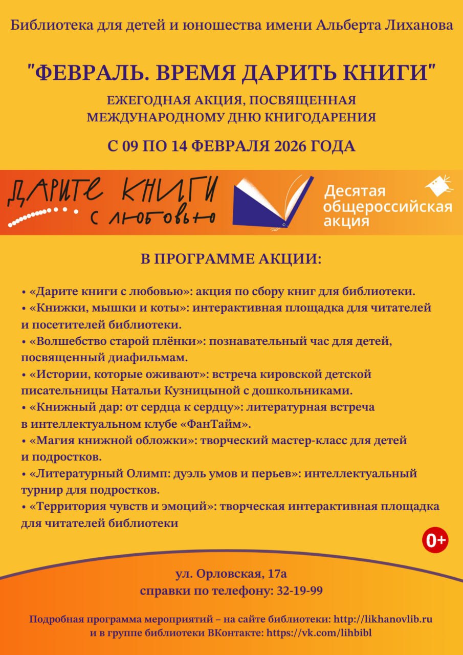 С 9 по 14 февраля в Библиотеке имени Альберта Лиханова (ул. Орловская, 17а) пройдет ежегодная акция, приуроченная к Международному дню книгодарения.