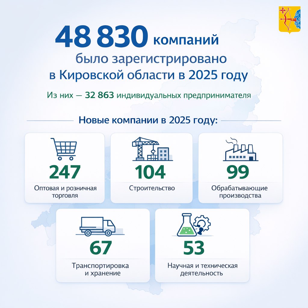 В Кировской области по итогам 2025 года работали 48 830 компаний, из них 32 863 это индивидуальные предприниматели. За год их число выросло на 2299.