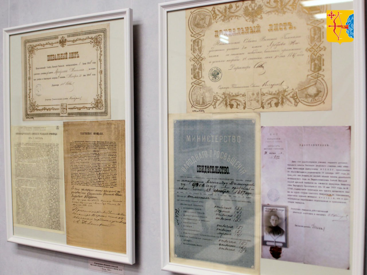 В числе наиболее интересных экспонатов — альбом гимназистки Марии Добрыниной с записями стихов, табель ученика Вятской мужской гимназии и табель воспитанницы Вятского Епархиального женского училища, свидетельство о прохождении испытаний (экзамена) в Вятской женской гимназии.