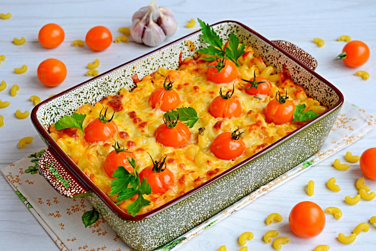 Залить смесью макароны, равномерно распределив по всей поверхности. Сверху украсить помидорами черри и натертым сыром. Выпекать в заранее разогретой до 180°С духовке на протяжении 30 минут до образования золотистой корочки.