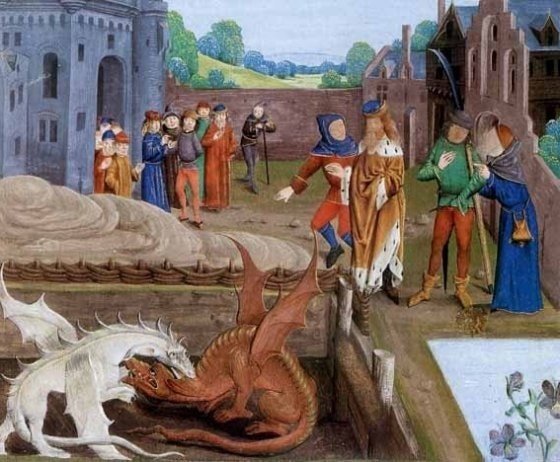 С именем Мерлина связано множество событий, например, когда король Вортигерн, опасаясь восстания, пригласил магов, чтобы разгадать тайну строительства своей башни. Мерлин, оказавшись там, раскрыл загадку, предсказав, что под землёй скрыто озеро с драконами, обеспечивающими разрушение фундамента.