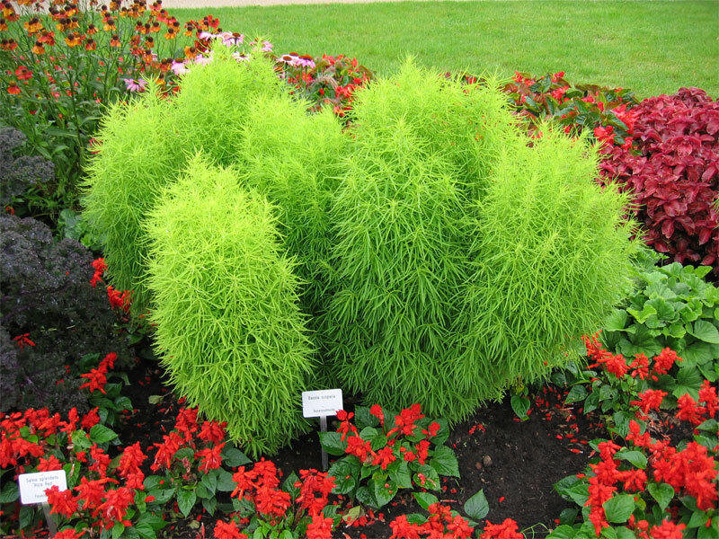 - Летний кипарис выделяется благодаря ярким кустикам с зелеными узкими листьями. К осени некоторые сорта могут изменять окраску на изумрудную или багровую.