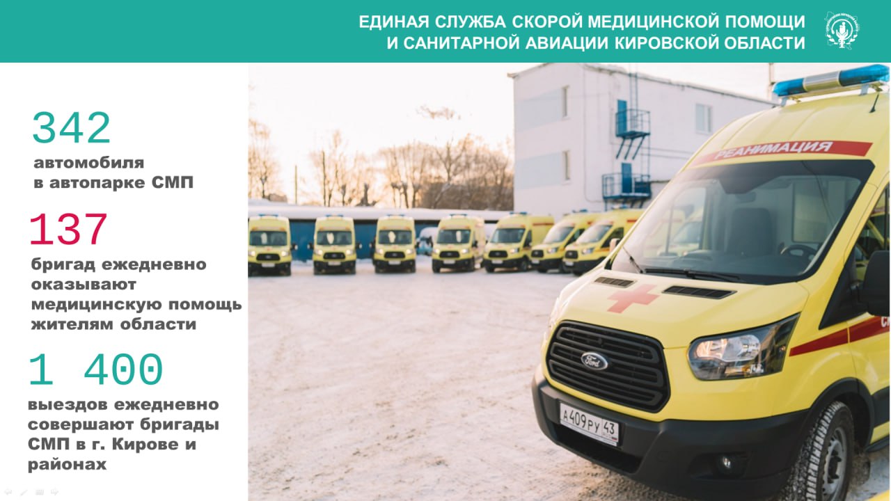 Ежедневно в Кирове и районах области бригады скорой медицинской помощи совершают до 1400 выездов. Общее количество выездов СМП в 2025 году составило около 350 тысяч.