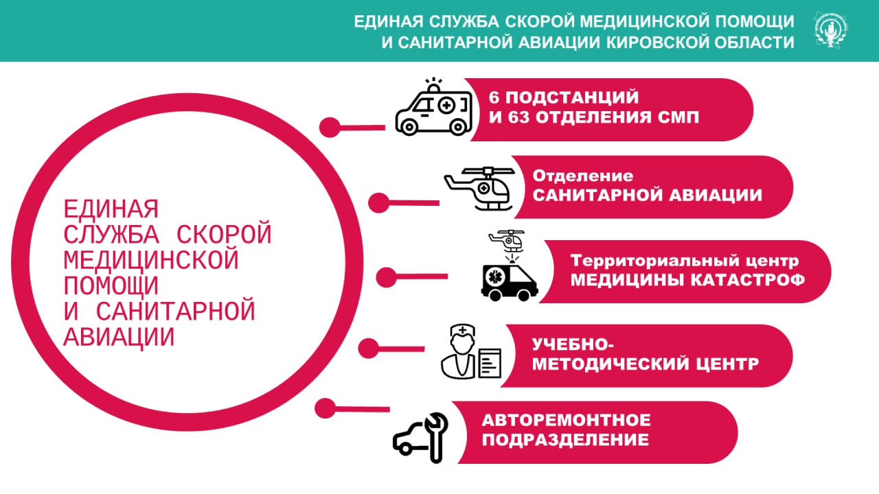 — Сегодня экстренная и неотложная медицинская помощь представлена Единой службой скорой медицинской помощи и санитарной авиации. Ее централизация состоялась в 2017 году. Служба объединяет 6 подстанций и 63 отделения скорой помощи в г. Кирове и во всех районах Кировской области, отделение санитарной авиации, территориальный центр медицины катастроф, учебно-методический центр и авторемонтное подразделение. Это общая сеть с общим центром управления — Станцией скорой медицинской помощи г. Кирова, что позволяет принимать грамотные и оперативные решения по оказанию экстренной и неотложной медицинской помощи, повышая ее качество и доступность.