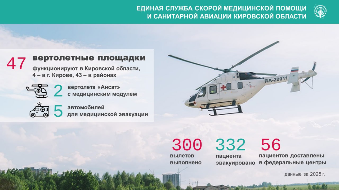 В 2025 году в Кировской области совершено 300 вылетов, эвакуировано 332 пациента, в том числе 48 детей. 56 пациентов доставлены силами санитарной авиации на прохождение специализированного лечения в федеральные медицинские центры.