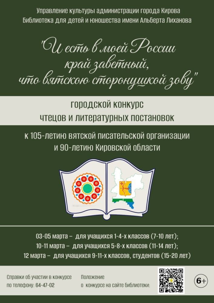 В библиотеке имени Альберта Лиханова ведется прием заявок на городской конкурс чтецов и литературных постановок «И есть в моей России край заветный, что вятскою сторонушкой зову», посвященный 105-летию местной писательской организации и 90-летию Кировской области.