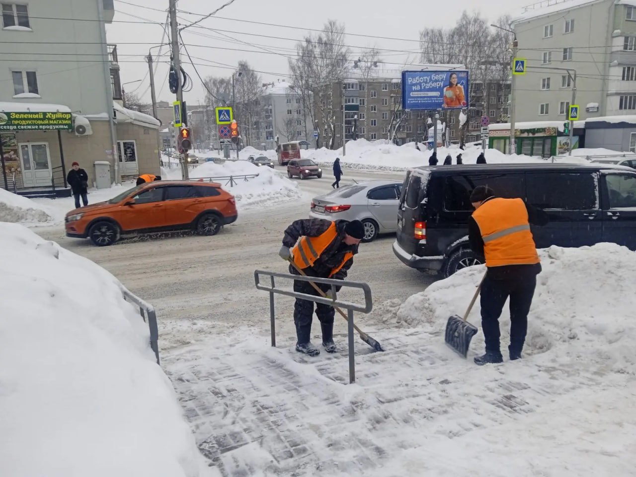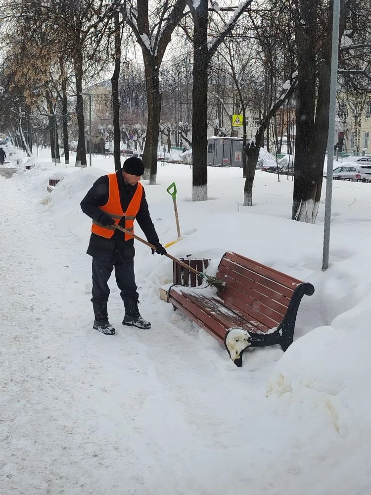 Специалисты ручного труда продолжают убирать рыхлый снег с подходов к пешеходным переходам, лестничных маршей, скамеек на аллеях и бульварах, остановочных площадках.