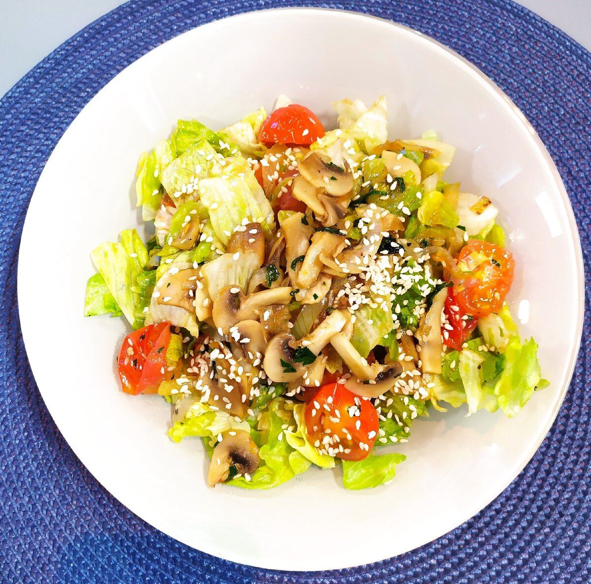 4. Пока грибы жарятся, нарежьте салат айсберг шашками, заправьте оливковым маслом и выложите в салатник. Сверху разместите грибы с помидорами и зеленью.