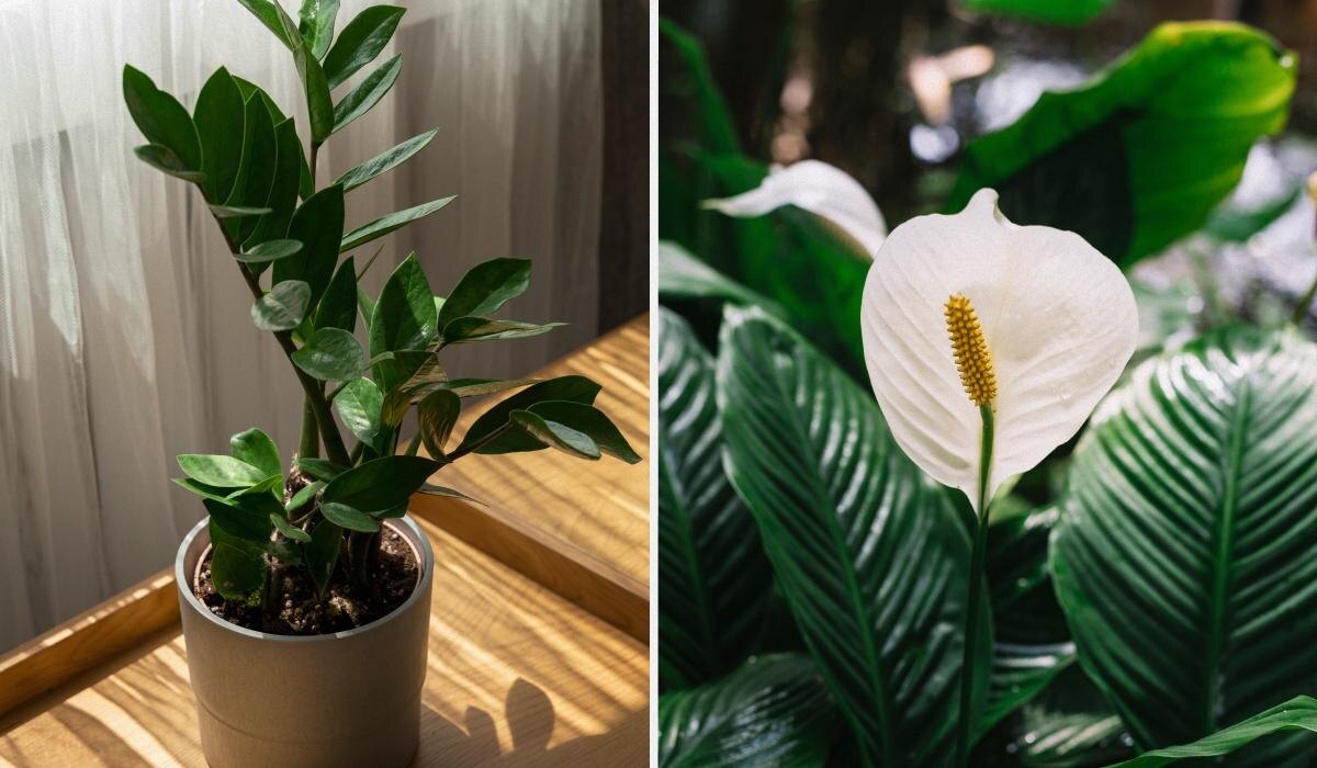 - Замиокулькас, более известный как «растение ZZ», выделяется среди прочих благодаря своей неприхотливости. Это растение можно смело назвать одним из самых лёгких для ухода: оно прекрасно развивается даже при слабом освещении, но прямых солнечных лучей лучше избегать. Поливать его стоит очень редко: достаточно одного раза в 4-6 недель.