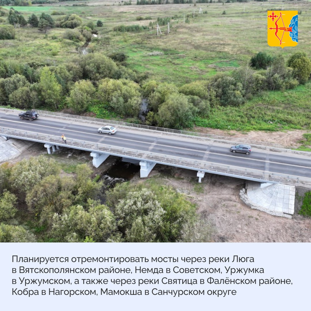 Планируется отремонтировать мосты через реки Люга в Вятскополянском районе, Немда в Советском, Уржумка в Уржумском, а также через реки Святица в Фалёнском районе, Кобра в Нагорском, Мамокша в Санчурском округе. Кроме того, глава региона поставил задачу подключить наружное освещение на региональных дорогах в 95 населенных пунктах в 30 муниципальных районах и округах.