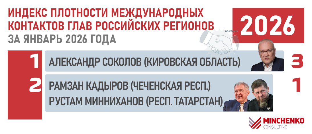 Эксперты «Минченко консалтинг» представили индекс плотности международных контактов глав регионов по итогам января-февраля 2026 года. Губернатор Кировской области Александр Соколов стал лидером рейтинга, набрав 3 балла.