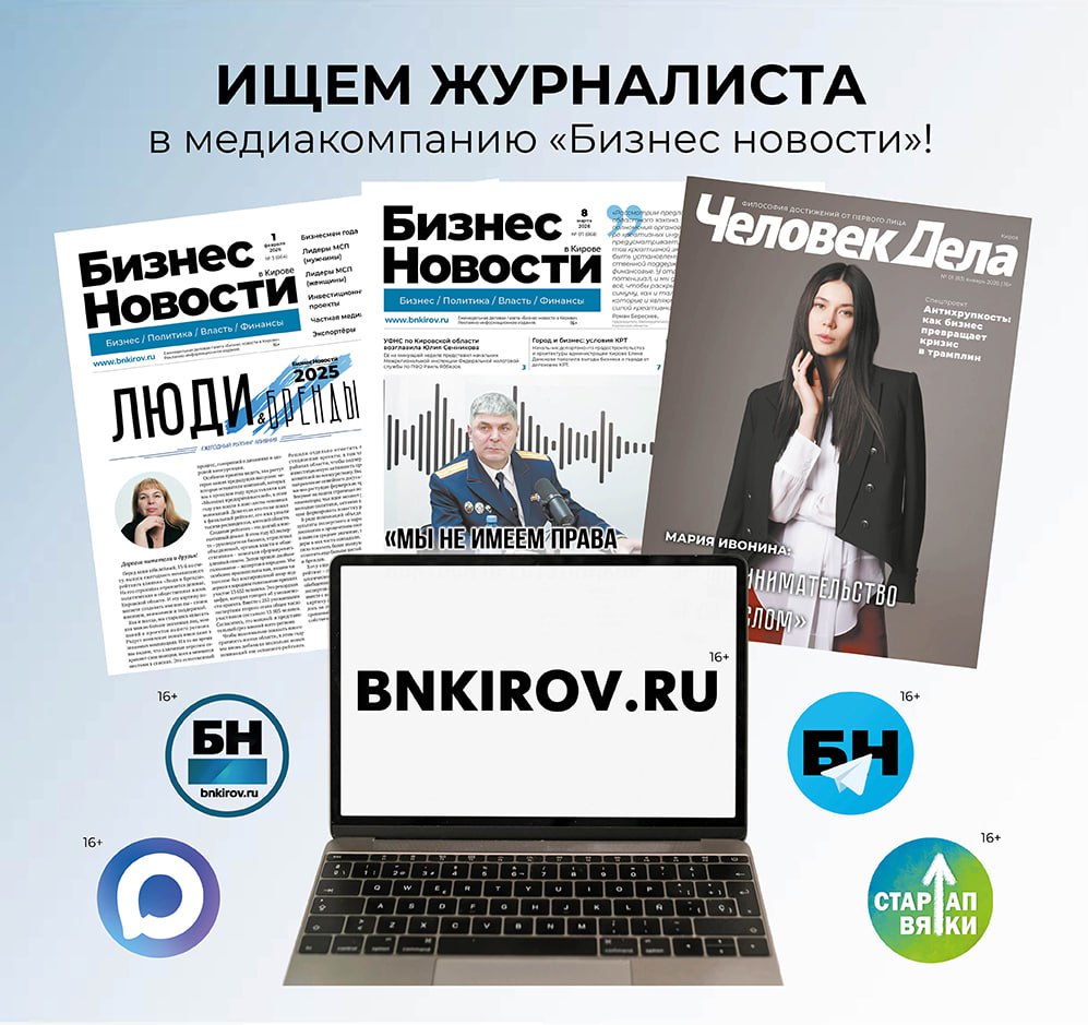 Медиакомпания «Бизнес новости» (входит в ГК ИНМЕДИА) ищет журналиста. Это не просто ежедневная новостная лента: в портфеле изданий — газета, журнал «Человек дела-Киров», портал bnkirov.ru, Telegram-каналы, канал в МАХ и рейтинг «Люди и Бренды»(16+).