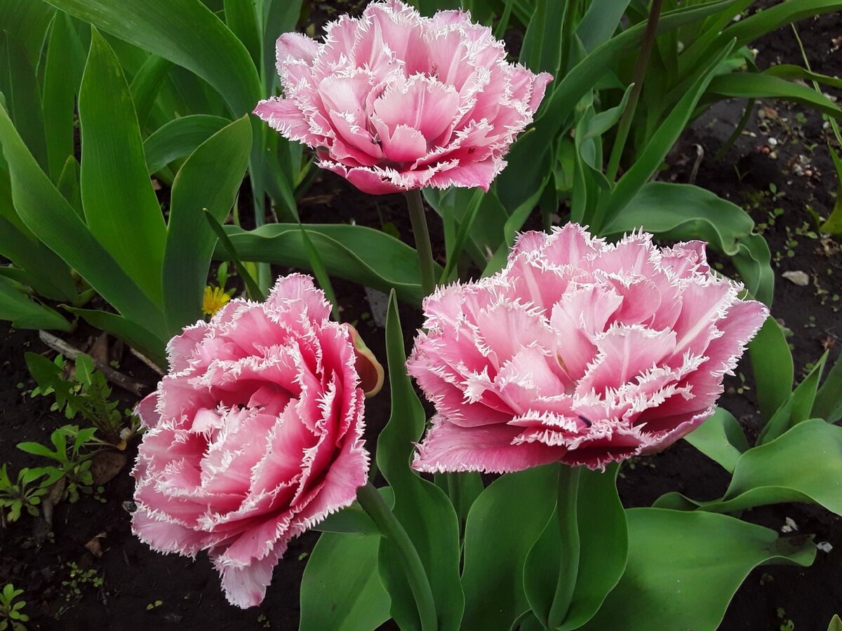 - Тюльпаны: Для создания насыщенного цветника выбираются махровые и бахромчатые сорта, как, например, тюльпан Perth. Простота в уходе — не главное, главное — эстетика.