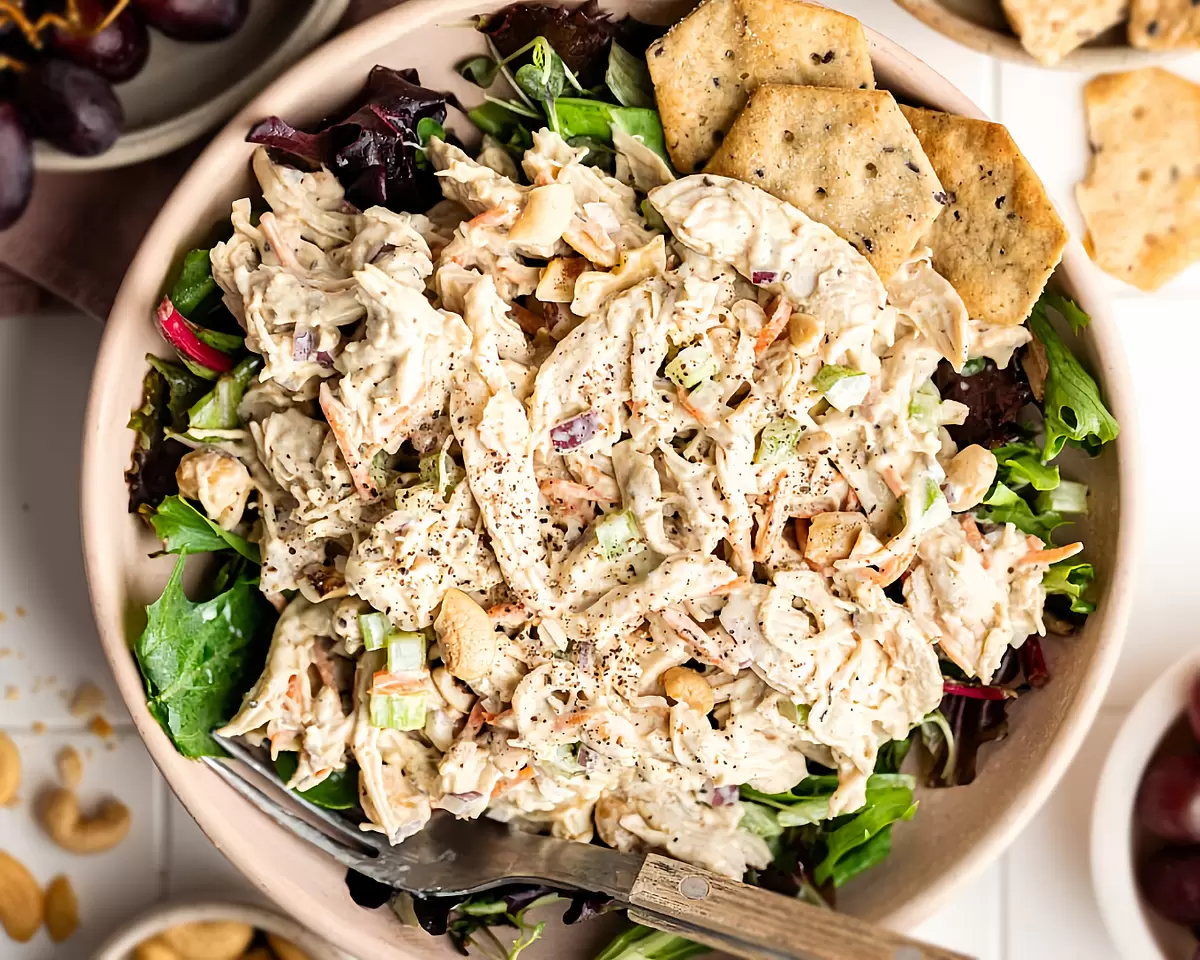 Глаз ловит простоту: за считанные минуты можно собрать блюдо, которое и по вкусу, и по настроению подходит к любому столу. Нежная заправка из йогурта, горчицы и меда гармонирует с сочной курицей и хрустящими орехами кешью, превращая обычный ужин в лёгкое наслаждение.