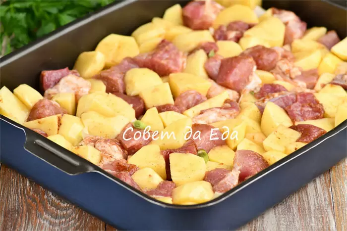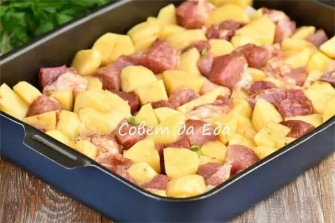 Это блюдо порадует простотой и восхитительным вкусом благодаря особому соусу. Для него понадобится 800 г свиной лопатки, нарезанной на средние куски, которые следует выложить в форму размером 26 на 35 см.