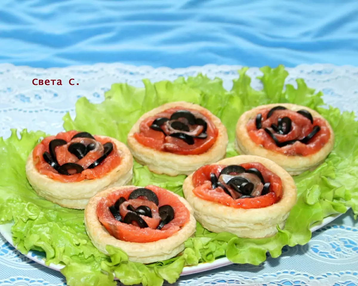Внутрь выкладывают полоски малосольного лосося, оформленные в виде красивых розочек, а также украшают маслинами, нарезанными полукольцами. Эти волованы не только порадуют ваш глаз, но и вызовут восторг у всех гостей.