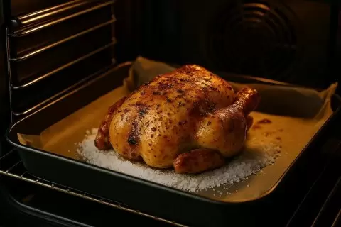 Курицу помещают на соль грудкой вверх и отправляют в заранее разогретую духовку. Рекомендуемая температура — 180°C на 1 час 20 минут для птицы весом около 1,6 кг. В конце можно увеличить температуру до 220°C на 10 минут для золотистости корочки.