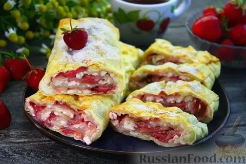- Рулет лаваша с творогом и клубникой: Хрустящий лаваш, наполненный нежным творогом и спелыми ягодами, запеченный до золотистой корочки — идеальная пара для чашечки ароматного чая.