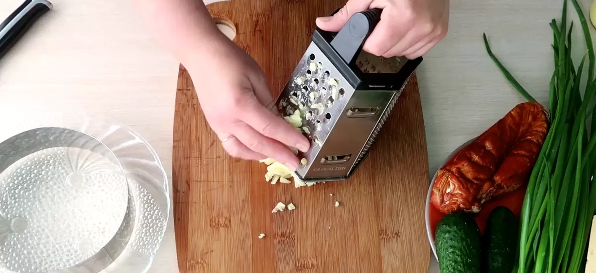 Отваренные вкрутую яйца натереть на мелкой терке и либо аккуратно раскладывать сверху без прижатия, либо объединить с другими слоями. По тому же принципу натереть сыр и выложить его в виде горки на салат. После этого отправить все в холодильник на 30 минут.