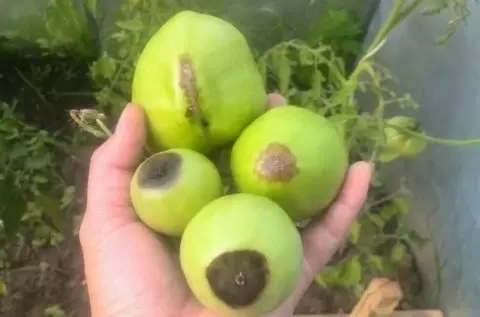 - Вершинная гниль. Эта проблема проявляется в виде темных водянистых пятен на верхушке плода, особенно часто поражая зеленые и недозрелые томаты.