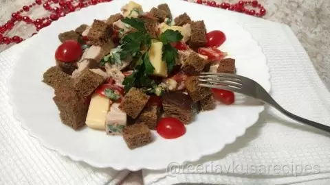 В это время можно заняться мясом: отваренное индюшиное или куриное филе нарезается на кусочки, а сыр – на небольшие кубики. Помидоры черри также делятся пополам, придавая салату свежесть и яркость.