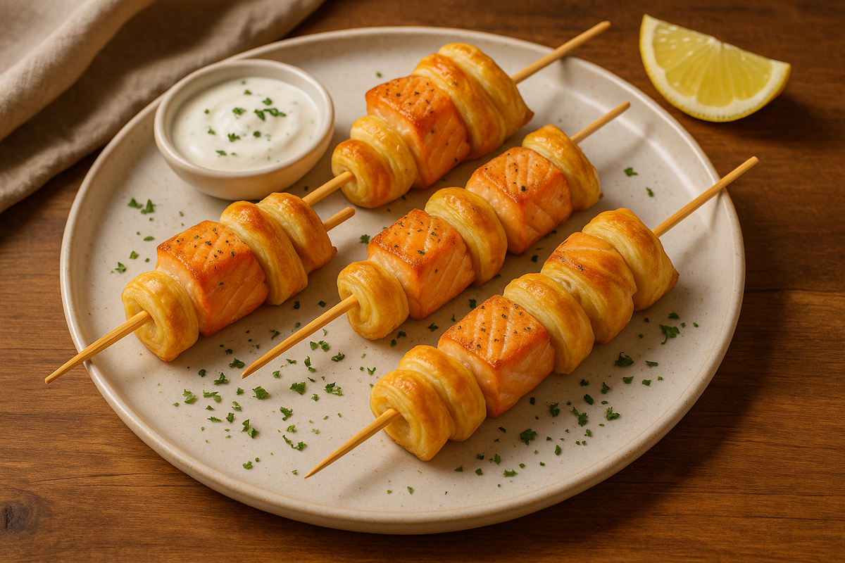Мини-шашлычки из лосося в слоёном тесте