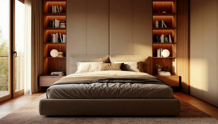 Рекомендуется размещать кровать так, чтобы изголовье упиралось в стену, а ноги не соприкасались с дверью. Так вы сможете увидеть вход, не находясь прямо против него, что обеспечит чувство контроля над пространством. Такой подход часто приводит к более глубокому и спокойному сну.