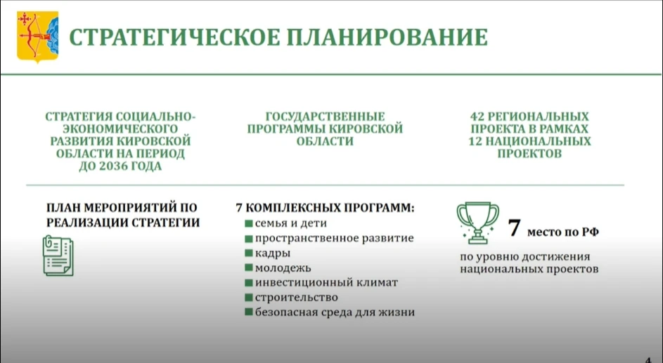 С 2025 года в регионе реализуется 42 региональных проекта по 12 направлениям национальных проектов. По федеральной оценке, по итогам 4 квартала 2025 года Кировская область заняла 7 место в рейтинге субъектов Российской Федерации по уровню достижения национальных проектов. Общий объем средств, направленный в 2025 году на реализацию национальных проектов, составил 22,9 млрд рублей, из них 15,5 млрд рублей – федеральные средства.