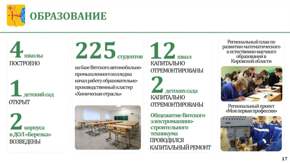 В 2025 году в городе Кирове построено 4 школы. В марте прошлого года принял первых детей новый детский сад в Слободе Курочкины, который был построен за областные средства.